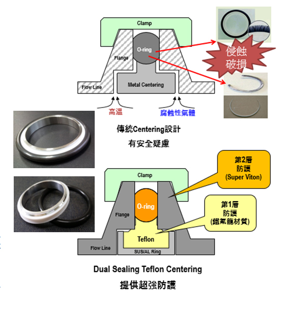 榮獲發明專利的特殊設計,提供腐蝕性與高溫管路的雙重安全連接,降低因連接環內密封圈被侵蝕老化導致漏氣的工安風險。此外,以鐵氟龍取代不鏽鋼的設計,讓不鏽鋼管和管連結更緊密,防止因幫蒲震動產生細微縫隙,導致管外微量氧氣與水氣進入管內與廢氣產生粉塵凝結而堵塞管路。