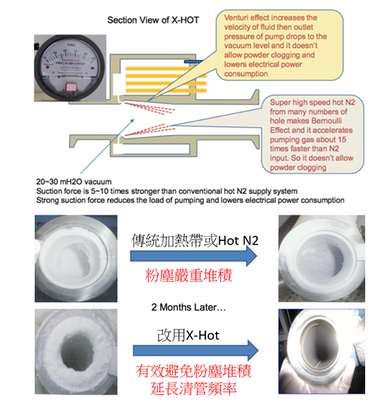X-Hot是改良型超高速熱氮氣(>150度C)噴射系統,提升真空幫浦排氣效能,降低製程產生的廢氣粉塵堆積於管路,大幅減少清管頻率與成本,提升機台可用於生產時間(Up-time)。